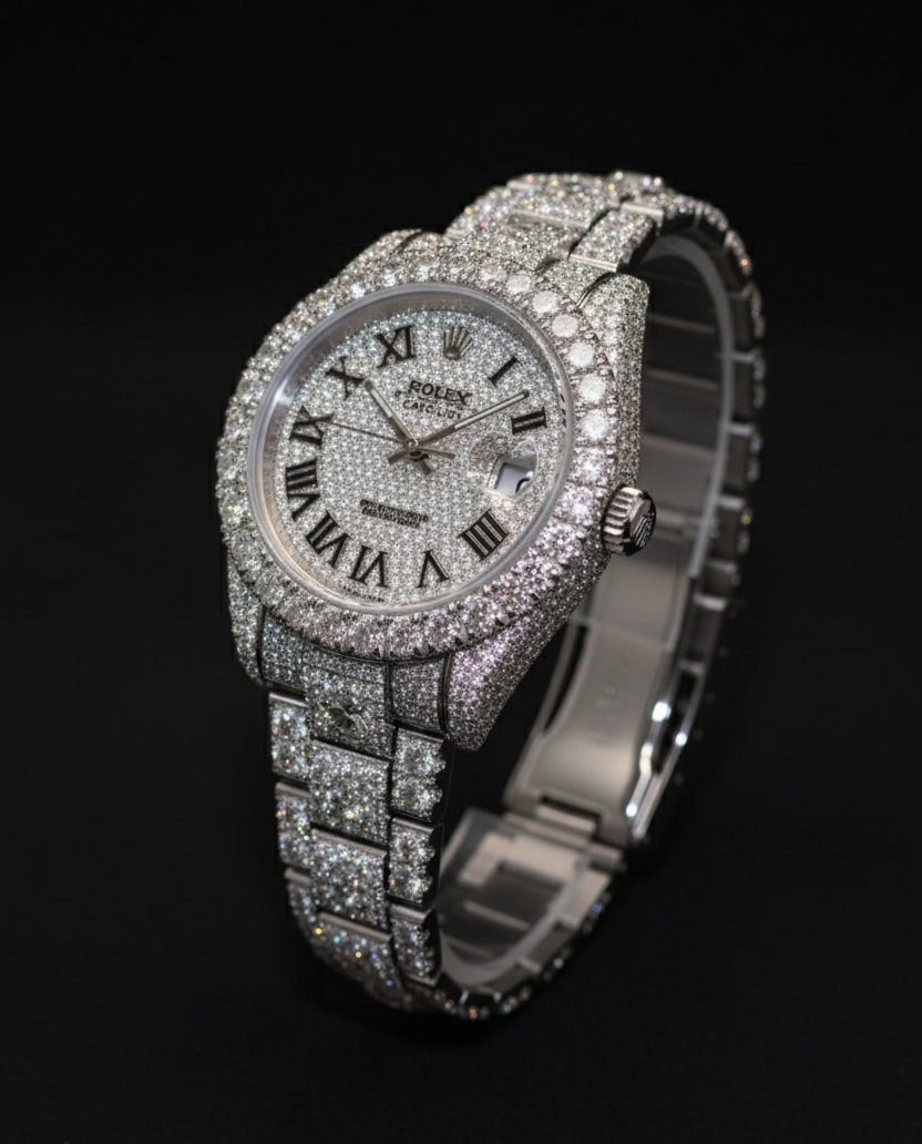 This 41mm luxury timepiece blends bold design with refined craftsmanship. Fully encrusted with brilliant stones from bezel to bracelet, it captures attention from every angle. The Japanese movement inside ensures reliable precision, while the intricate detailing on the dial and case gives it a premium, statement look. Perfect for those who appreciate style, performance, and a touch of extravagance.